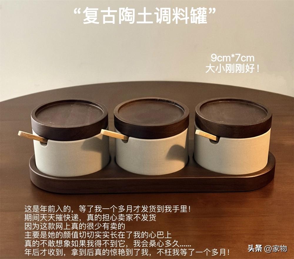沒錯,我個人感覺這調料罐放在廚房用簡直就是暴殄天物,胡桃木色蓋子+陶土罐身實在是太有質感了,放在家裏餐桌上就像是個精緻的擺件,平時喜歡喫辣椒醋和醬油的話,有它在餐桌上,也更方便~
