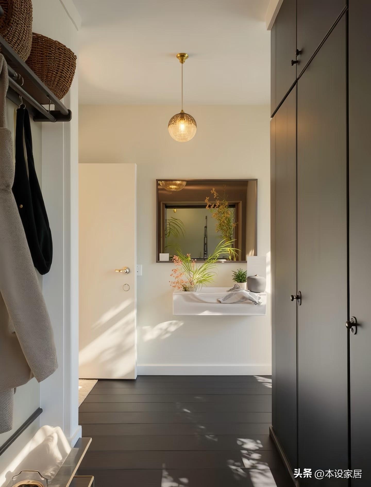 通往臥室的通道兩邊,分別做了開放式的收納架和深灰色木質衣櫃,行走其中,暖光燈的渲染,讓每一處光影都化身爲美夢。