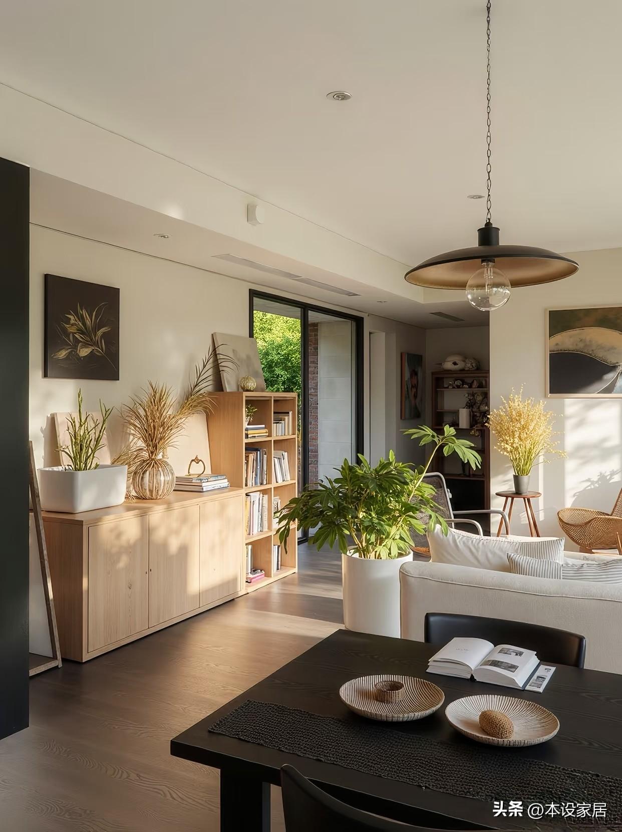 由於房子位於1樓,不僅在沙發背面佈置了餐廳和開放式廚房,而原先庭院的面積,也圍合進公區,並靠窗佈置咖色的柔軟沙發,邀請三五好友來家喝咖啡、聊聊八卦,沐浴着三月的陽光,別提多舒適了。