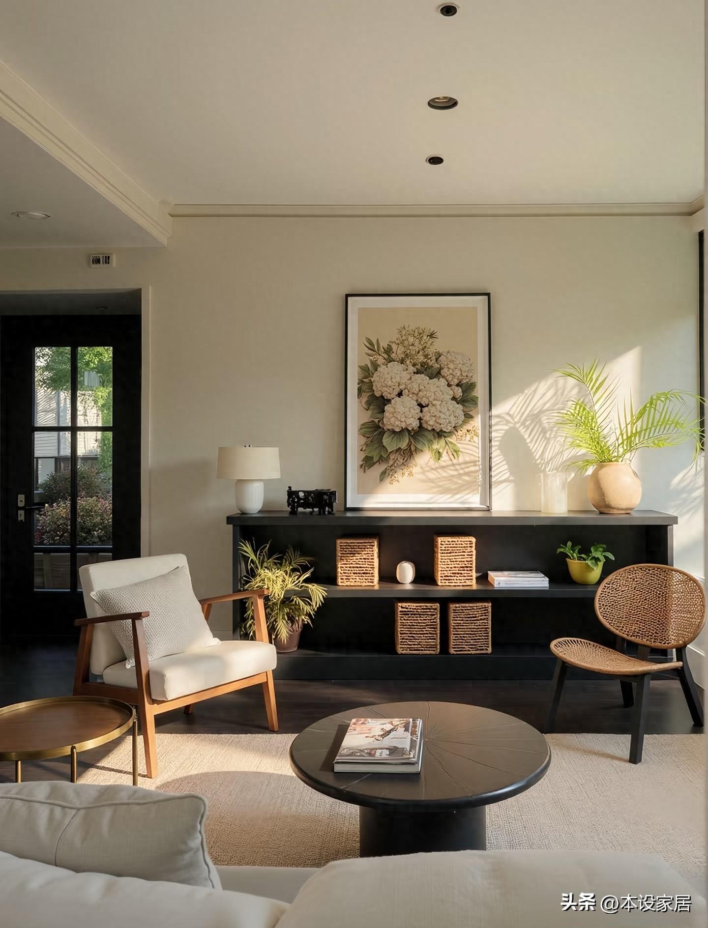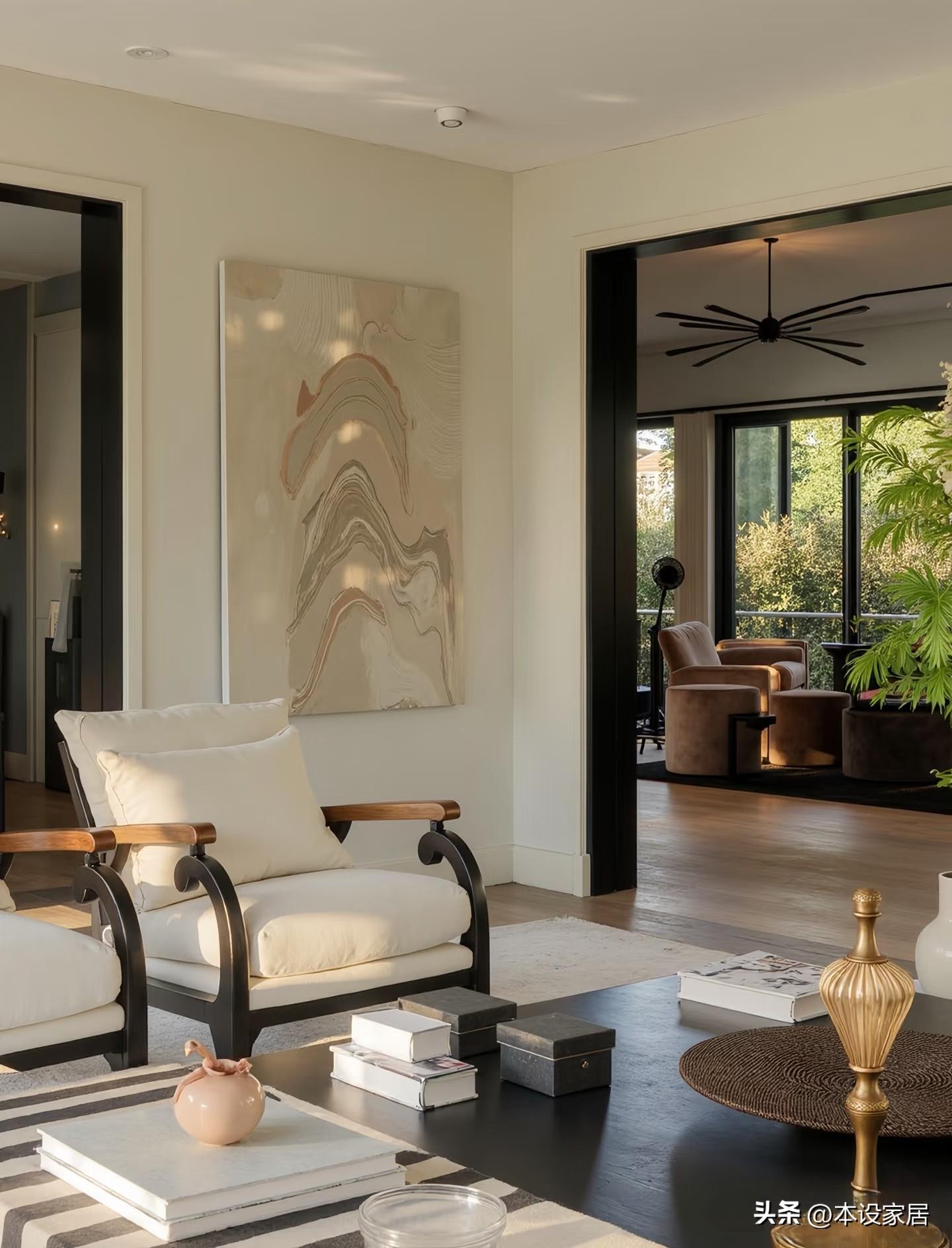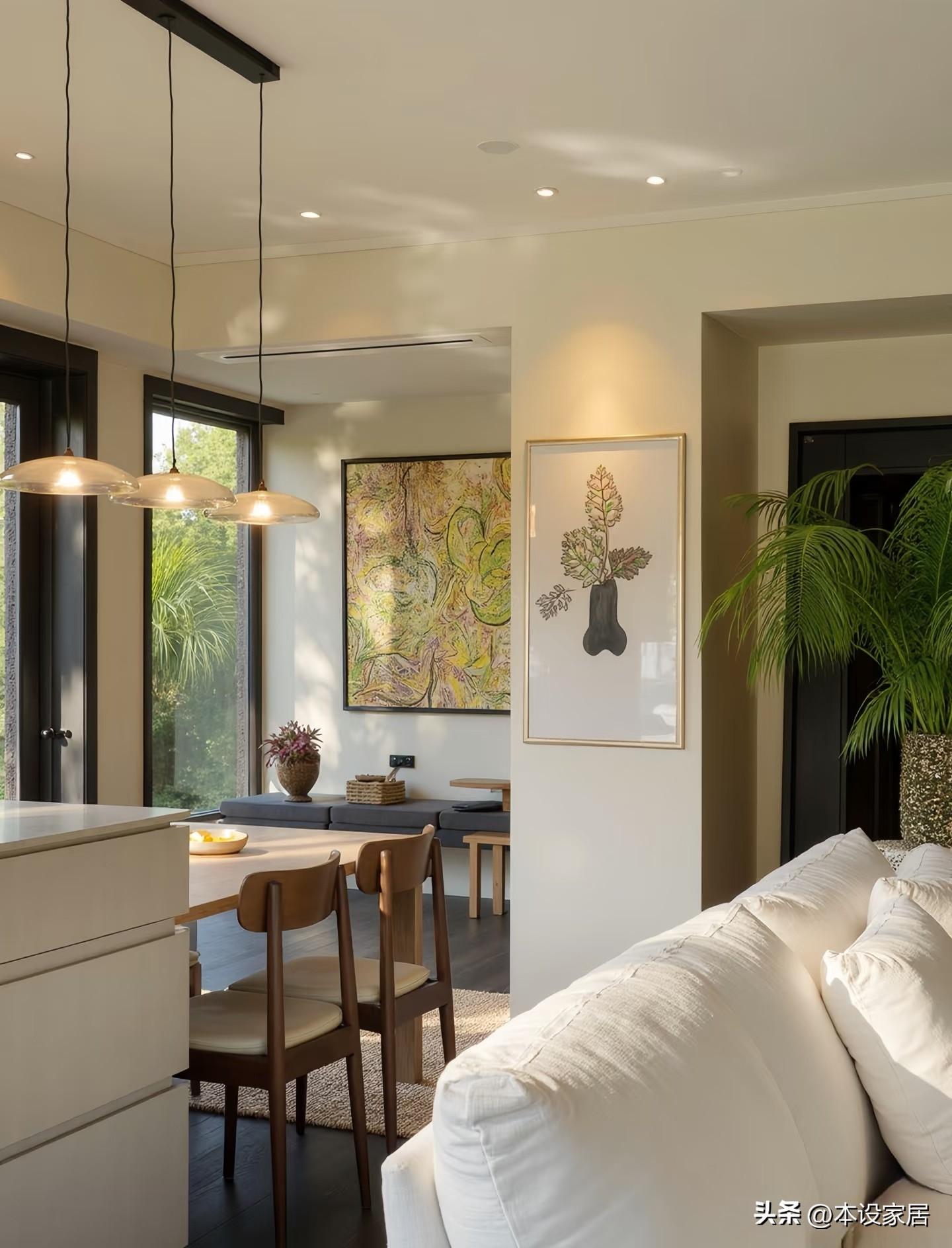 從客廳可以看出,全屋採用現代簡約風格,以米白色爲主基調,局部融入法式元素,搭配同色系的沙發和原木傢俱,將自然和大地完美融合,營造出一份浪漫典雅的居住氛圍。