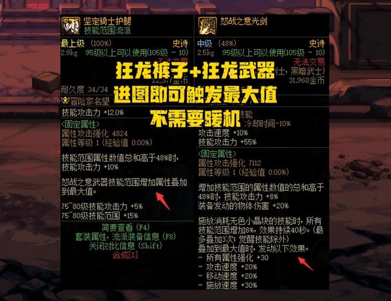 但現在,有了“騎士護腿”就不一樣了,可以直接進圖拉滿“狂龍武器”的技能範圍,而當“狂龍武器”範圍疊加最大值的時候,又能反過來觸發自己的10%技攻。
