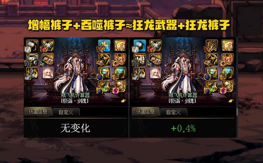 而且還有一個問題,可能很多玩家“增幅褲子”並沒有達到增幅紅12的程度,這種情況下,不管是傷害還是速度,實際表現都不如“狂龍2件套”。