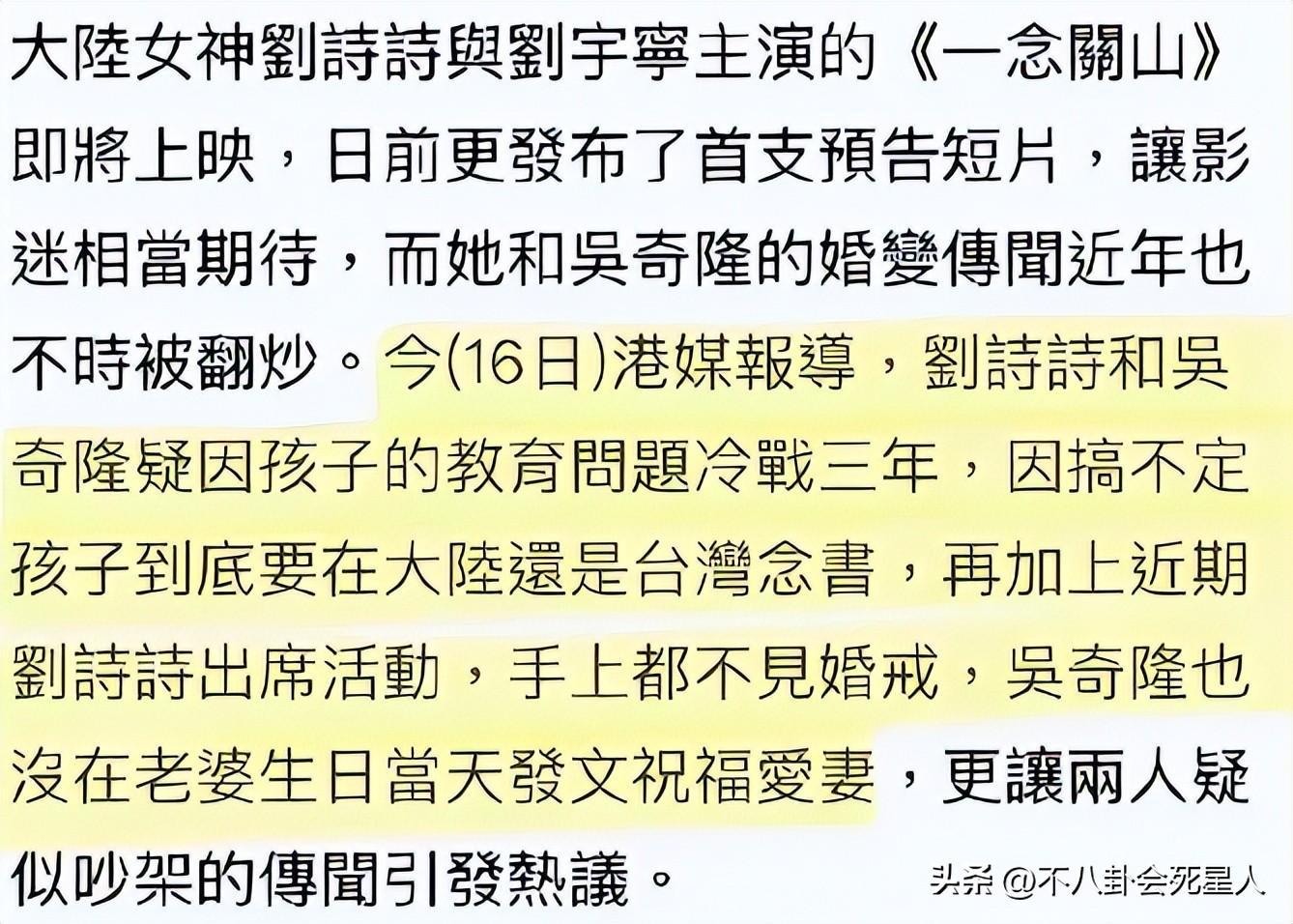 除此之外,還有傳聞稱劉詩詩結婚三年才懷孕,婆婆對她處處刁難,再加上吳奇隆和劉詩詩的互動越來越少,連生日都不送上祝福,劉詩詩也開始復出搞事業,讓許多網友對他們的婚姻並不信任。