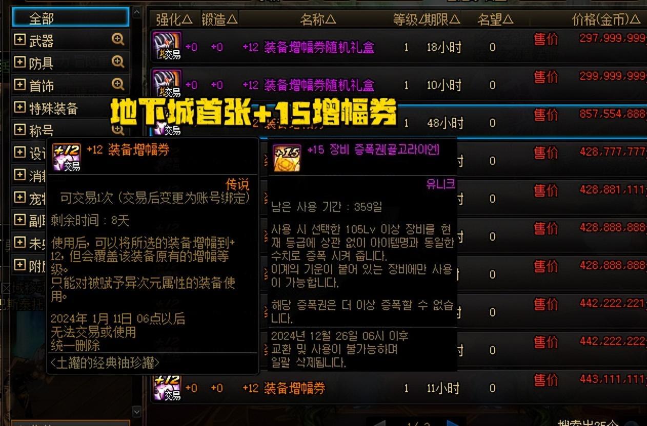 衆所周知,到目前爲止,整個地下城拍賣行可以直接購買的只有+12增幅券、以及+13強化券,這也基本代表着平民打造的天花板了,如果想要繼續往上增幅,那就只能靠運氣和實力硬懟了,不過韓服最近整了個大活。