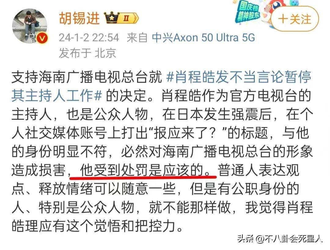 資深媒體人胡錫進就此事發布了意見,他支持海南電視臺的決定,認爲肖程皓是公衆人物,在個人賬號上如此公開嘲諷日本地震,必然會讓海南電視臺形象受損,所以肖程皓受到處罰是應該的,普通人釋放情緒可以隨意一些,但是公衆人物不能那樣做。