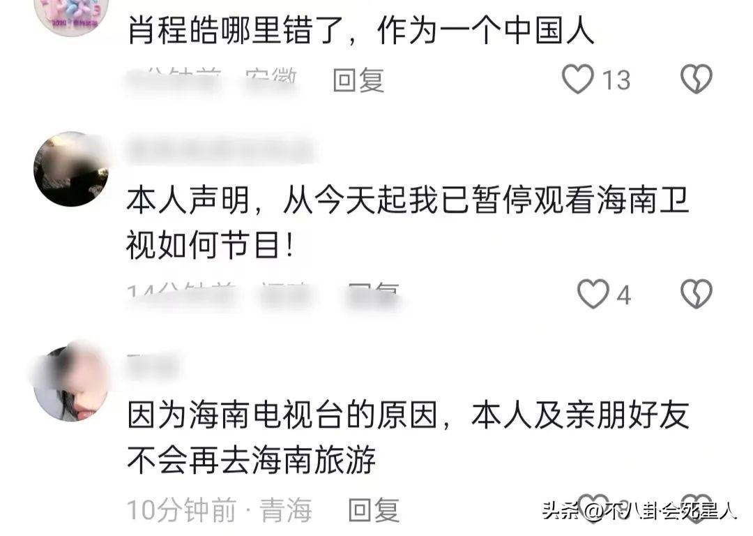 海南電視臺發佈聲明後,官博評論區很快淪陷,罵聲一片,不少人爲肖程皓鳴不平,認爲他沒說錯什麼,紛紛質問電視臺,甚至表示從此以後不會再關注海南電視臺,也不會去海南旅遊。