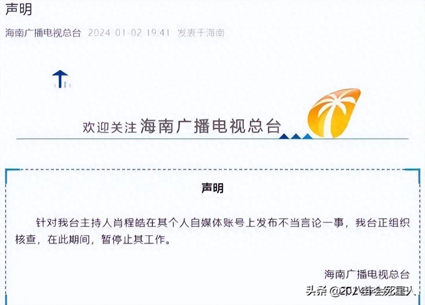1月2日,海南電視臺發佈聲明,針對主持人肖程皓在網上發佈的不當言論,正在開展覈查,在此期間,暫停職務。