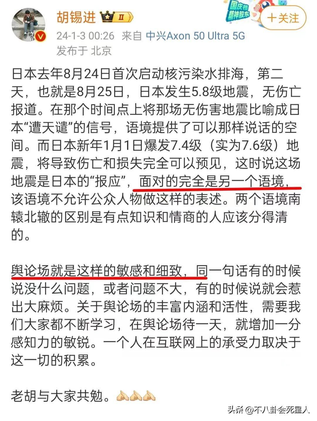 不知是不是被太多人罵,胡錫進有點“破防”了,在1月3日凌晨,他髮長文再次提起日本地震的事情,稱不能將2023年8月25日的地震,與2024年1月1日的地震混爲一談,感嘆輿論太敏感。