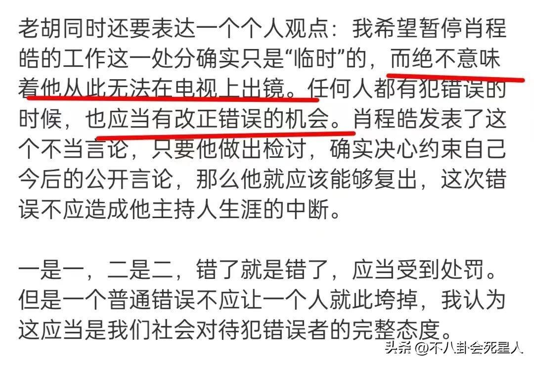 最後,胡錫進稱從他個人角度出發,希望暫停肖程皓工作,這個處分是“臨時”的,絕不意味着他從此無法在電視上出鏡,應當有改正錯誤的機會。