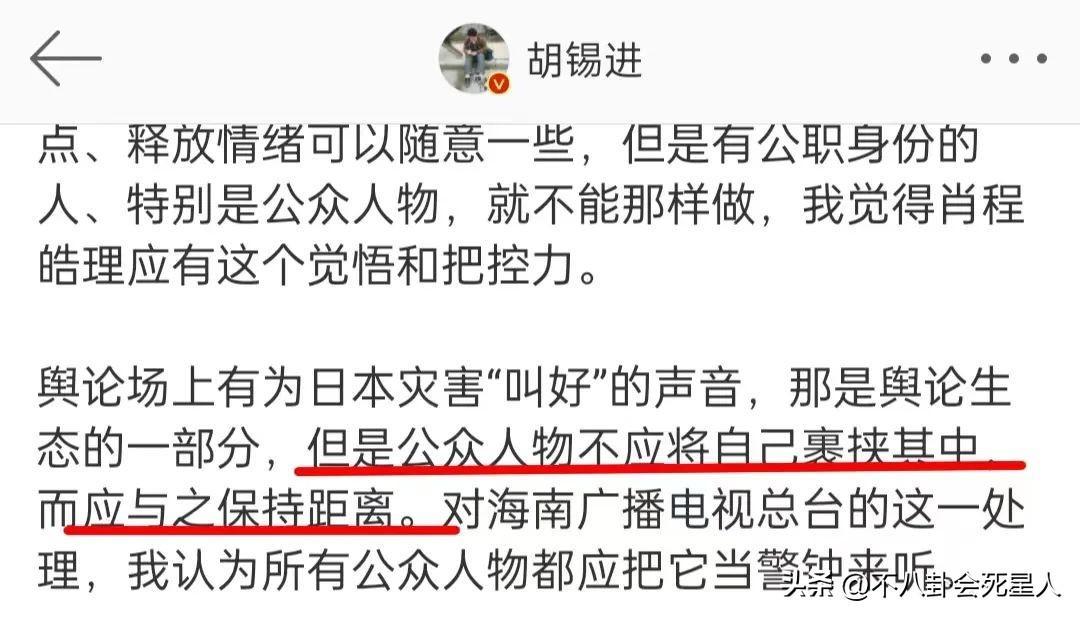 資深媒體人胡錫進就此事發布了意見,他支持海南電視臺的決定,認爲肖程皓是公衆人物,在個人賬號上如此公開嘲諷日本地震,必然會讓海南電視臺形象受損,所以肖程皓受到處罰是應該的,普通人釋放情緒可以隨意一些,但是公衆人物不能那樣做。