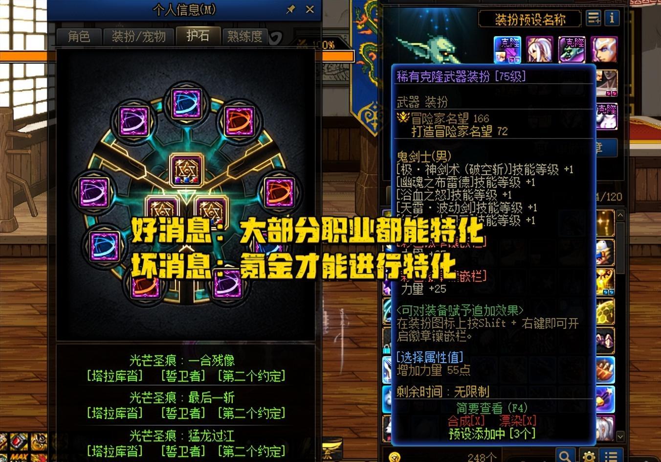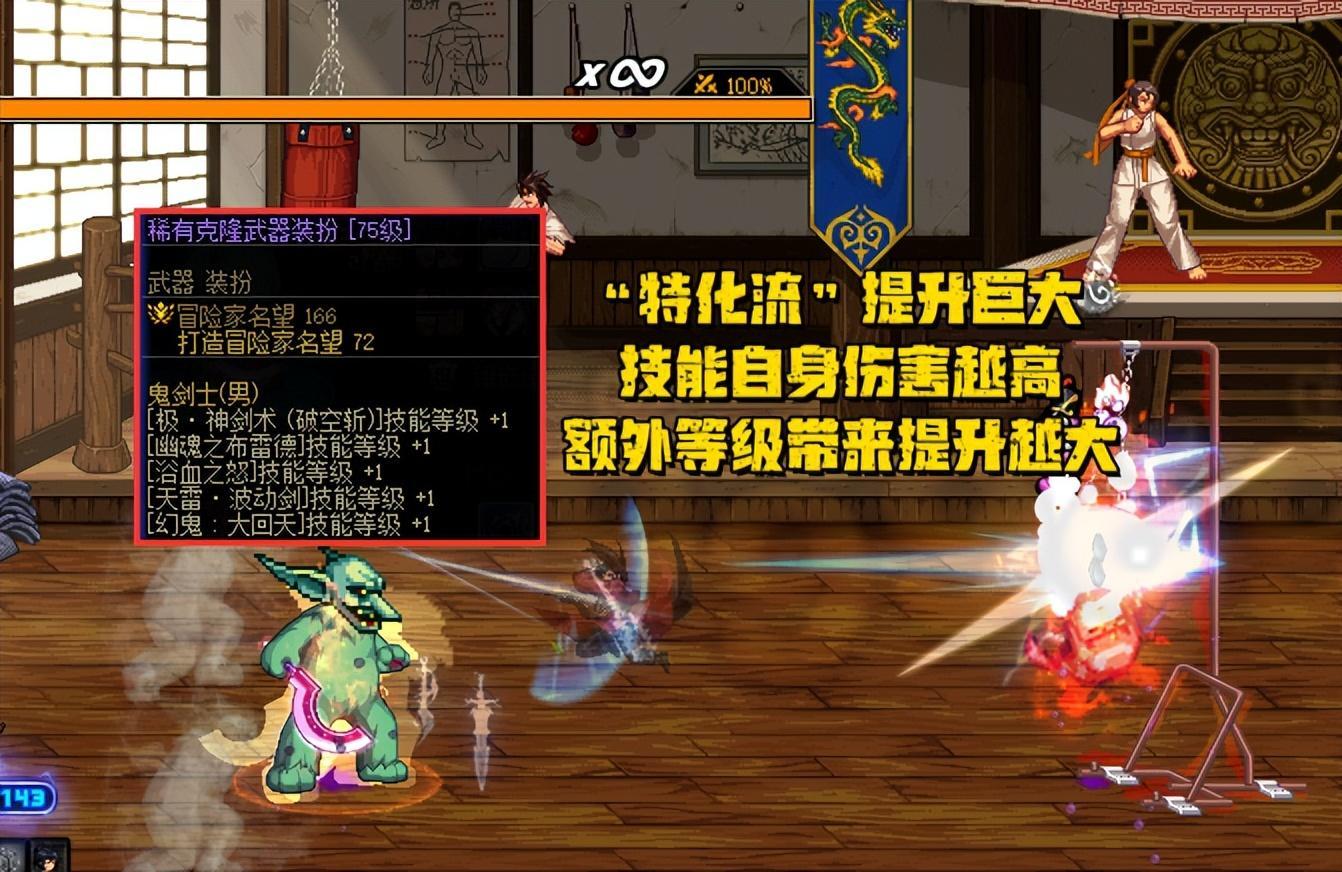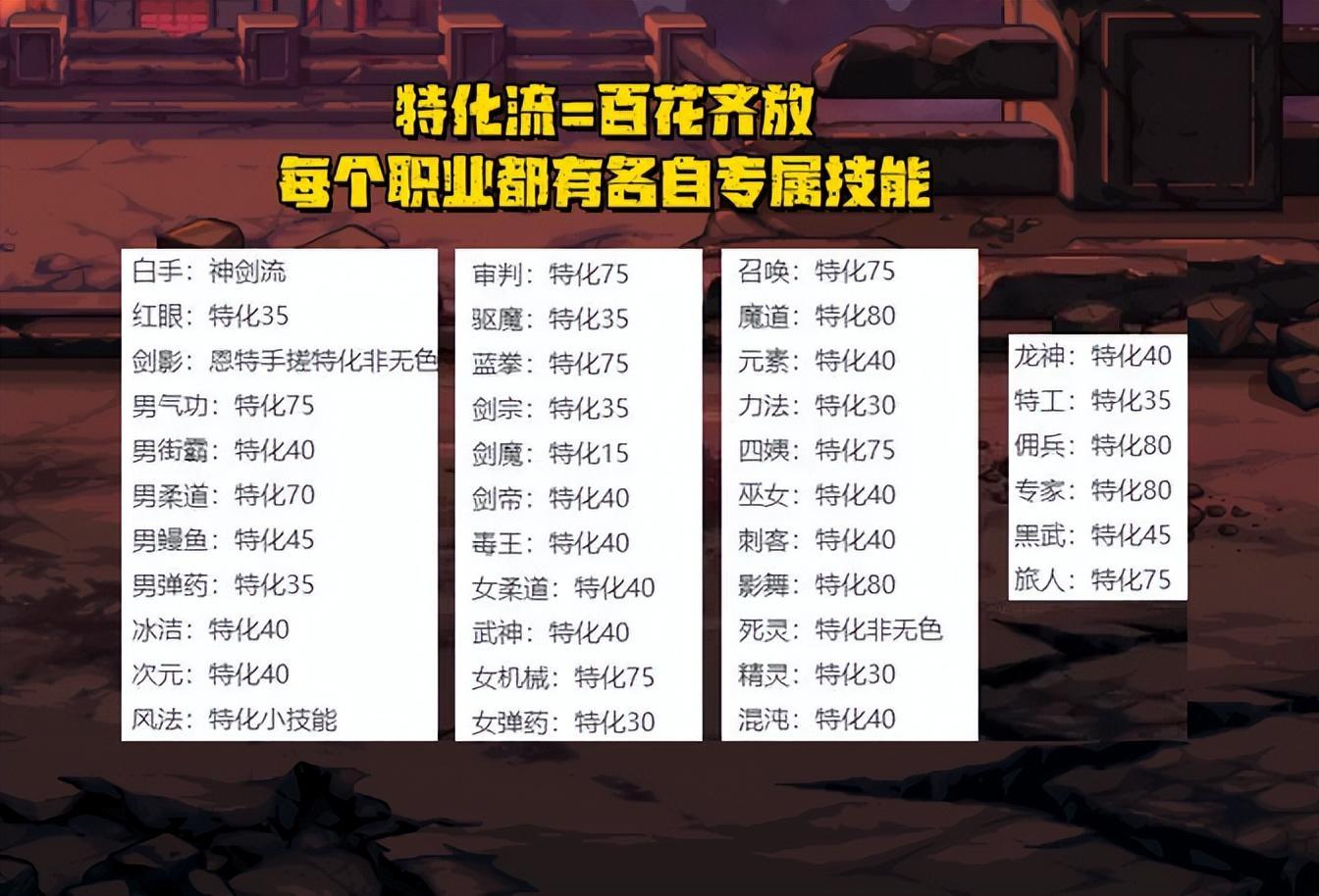正常情況下可能不太可能,但是別忘了,這可是“自定義”的版本,大部分職業都可以“特化流”,比如男氣功特化75技能、男漫遊特化45技能,劍帝特化40技能、魔道特化80技能等等。