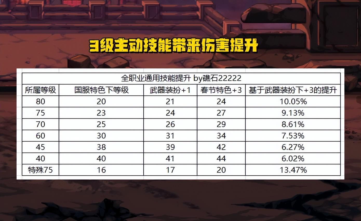 3級主動技能提升多少呢?單個技能提升在6~10%左右,大概來說就是技能本身傷害越高,技能等級帶來的提升就越大,尤其是像“劍魂”這種本就走特化75的職業,單個技能提升甚至可以達到13%!