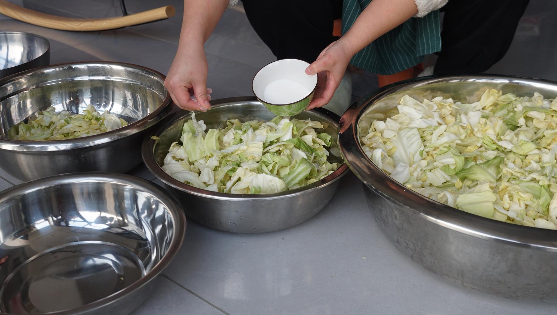 2、然後撒一小把鹽,用力的揉搓,把菜裏面的水分都揉出來,這時候包菜就會變的更軟了。