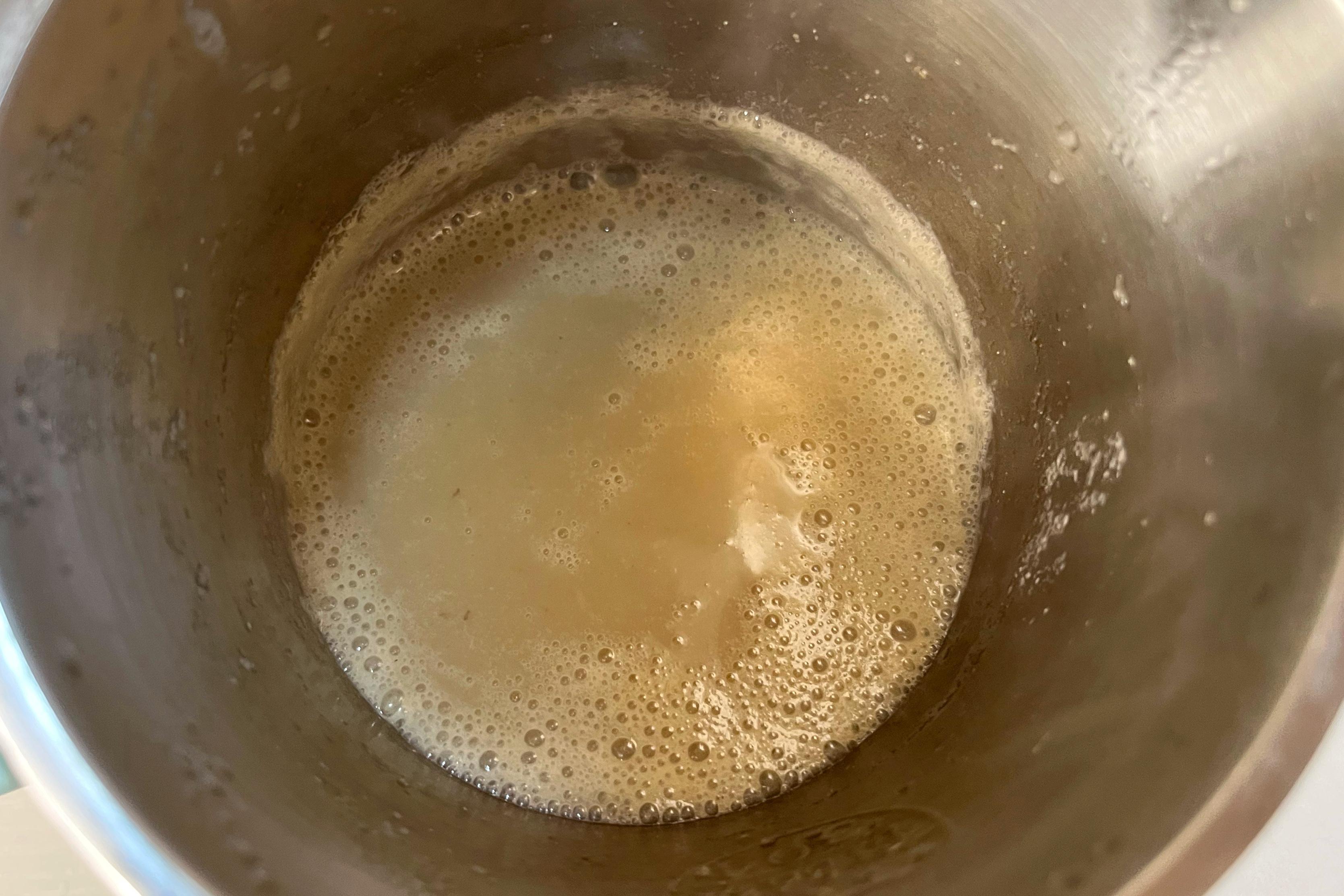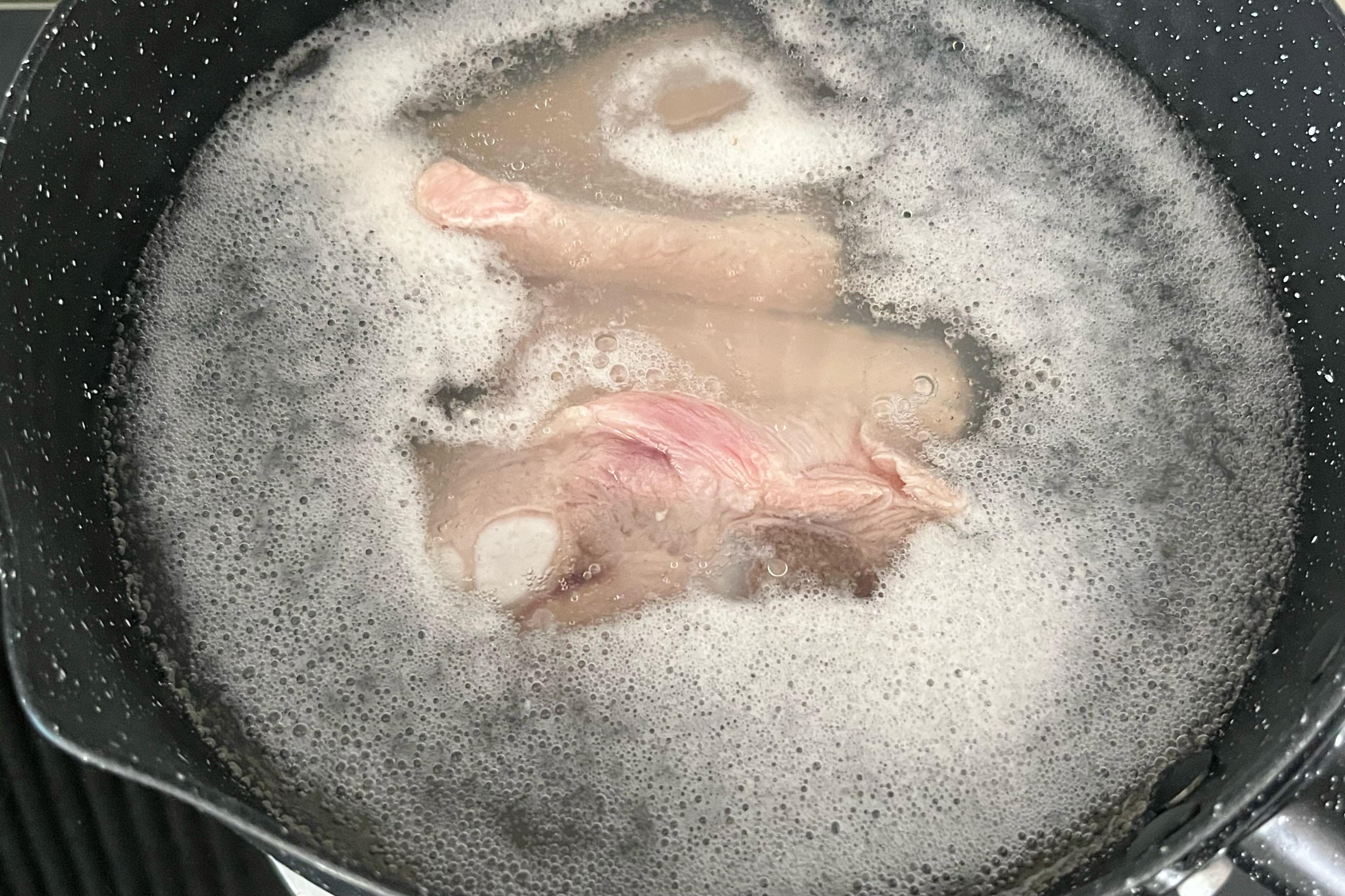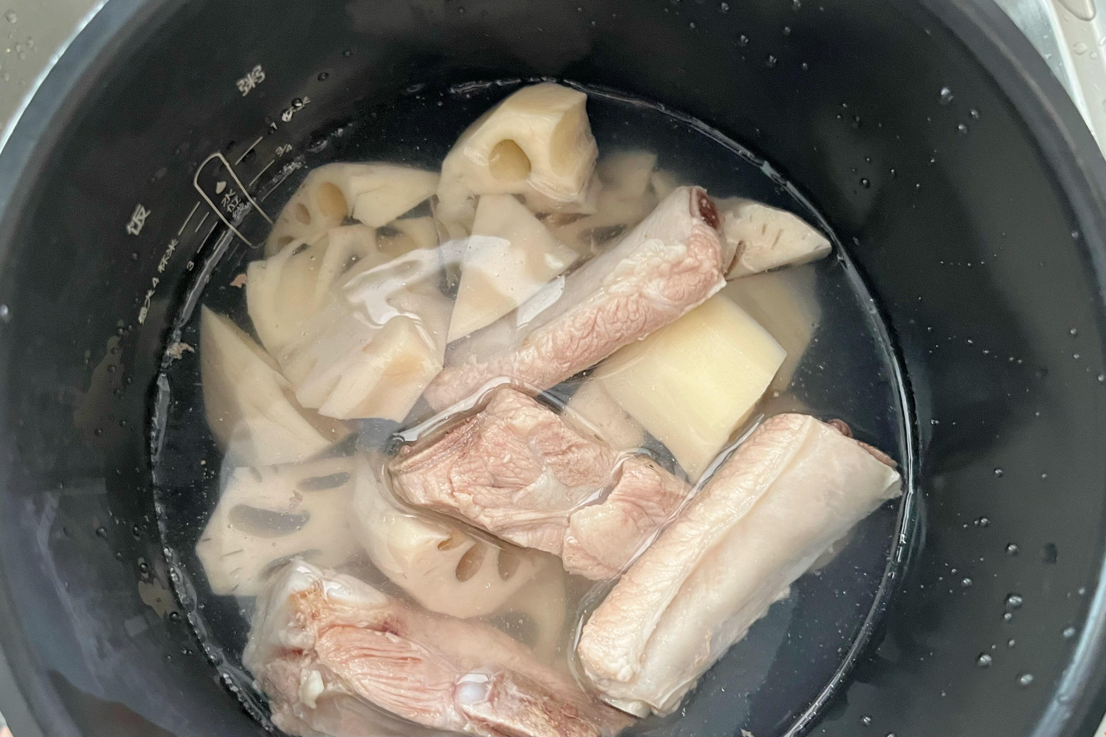 3、將排骨、蓮藕一起加入湯鍋中,再加足量熱水;
