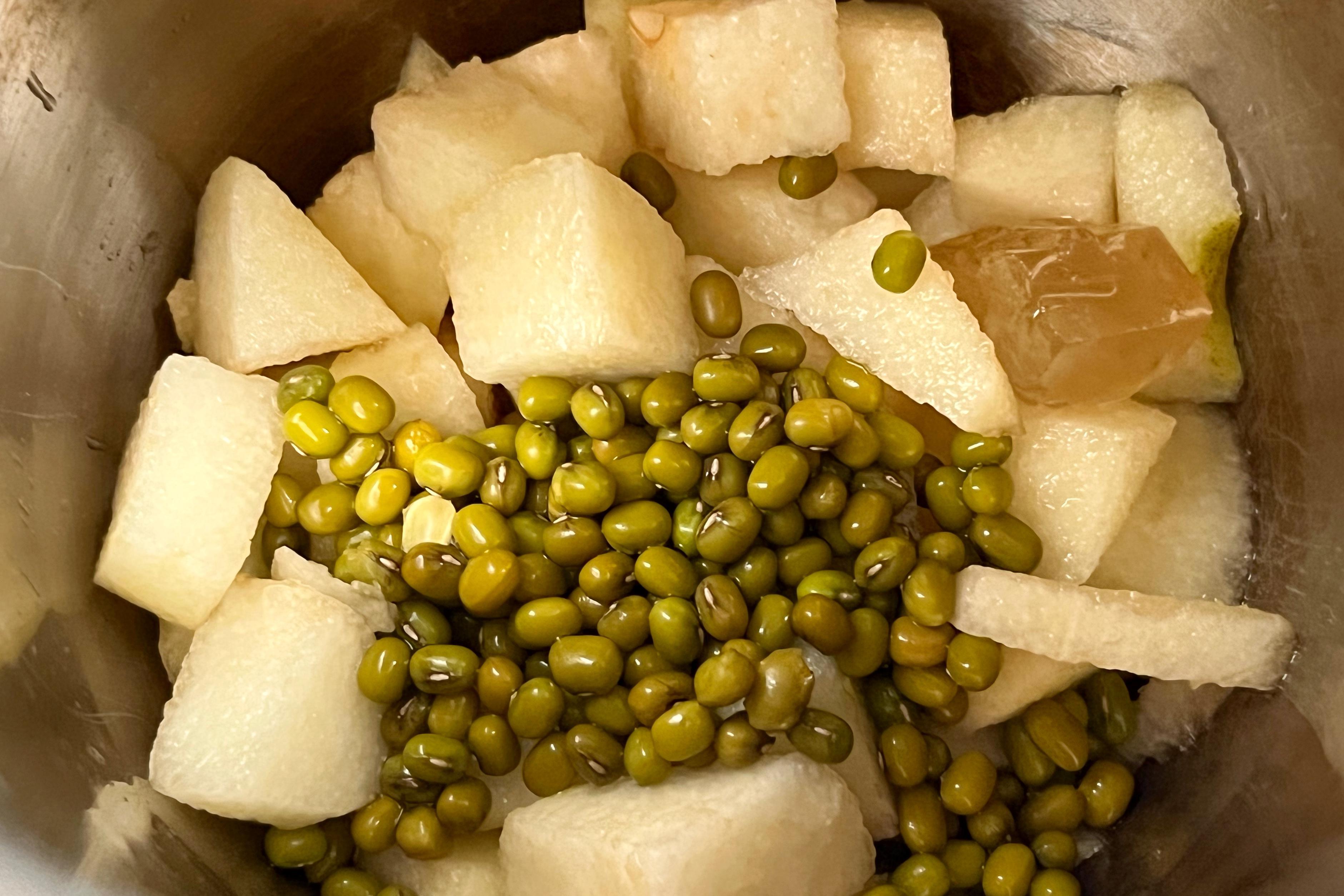 2、將雪梨、綠豆一起加入豆漿機或破壁機中,再放入1大塊老冰糖;