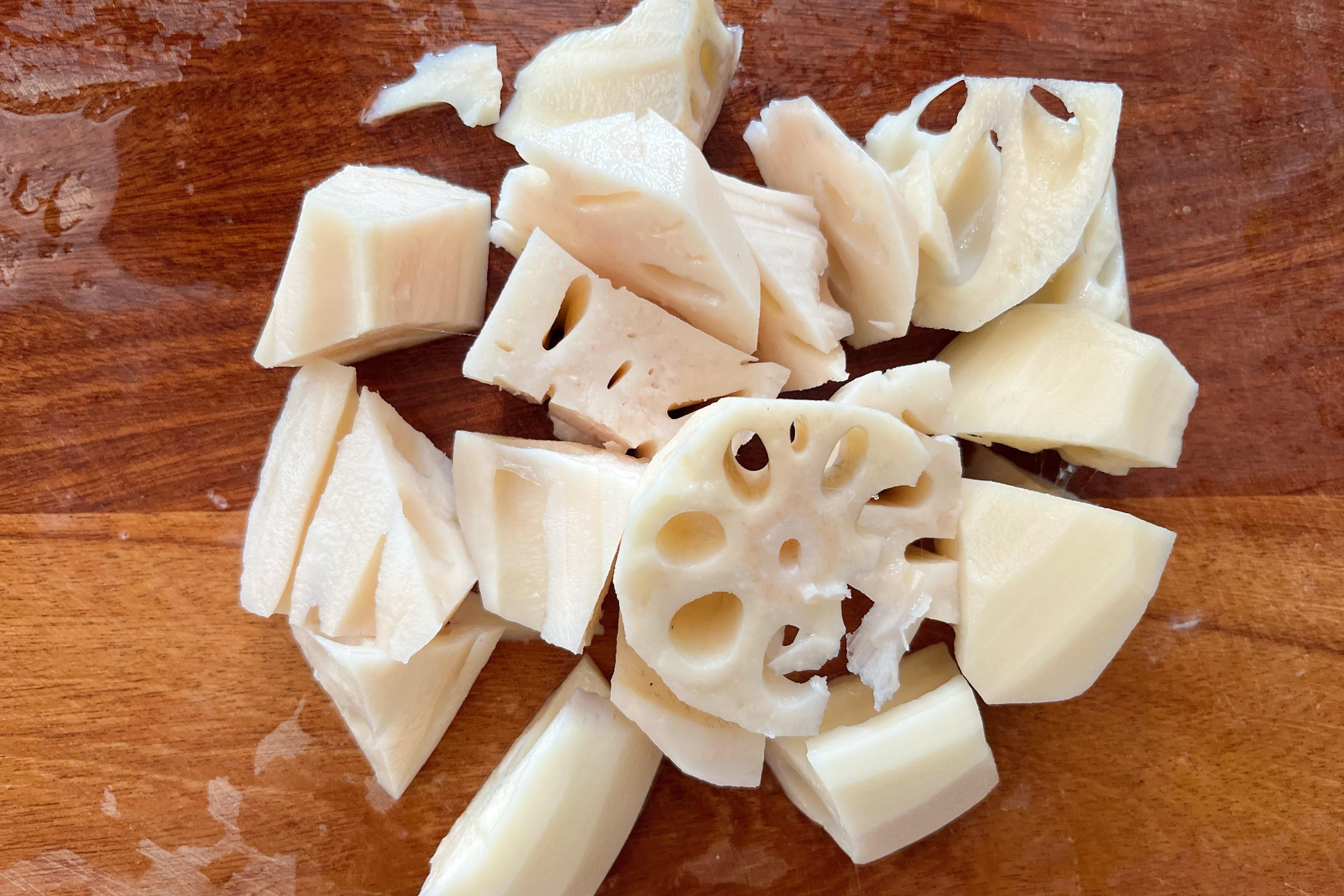 2、蓮藕削皮後洗淨,切成大塊狀,記得要切大塊,不然容易煮爛;