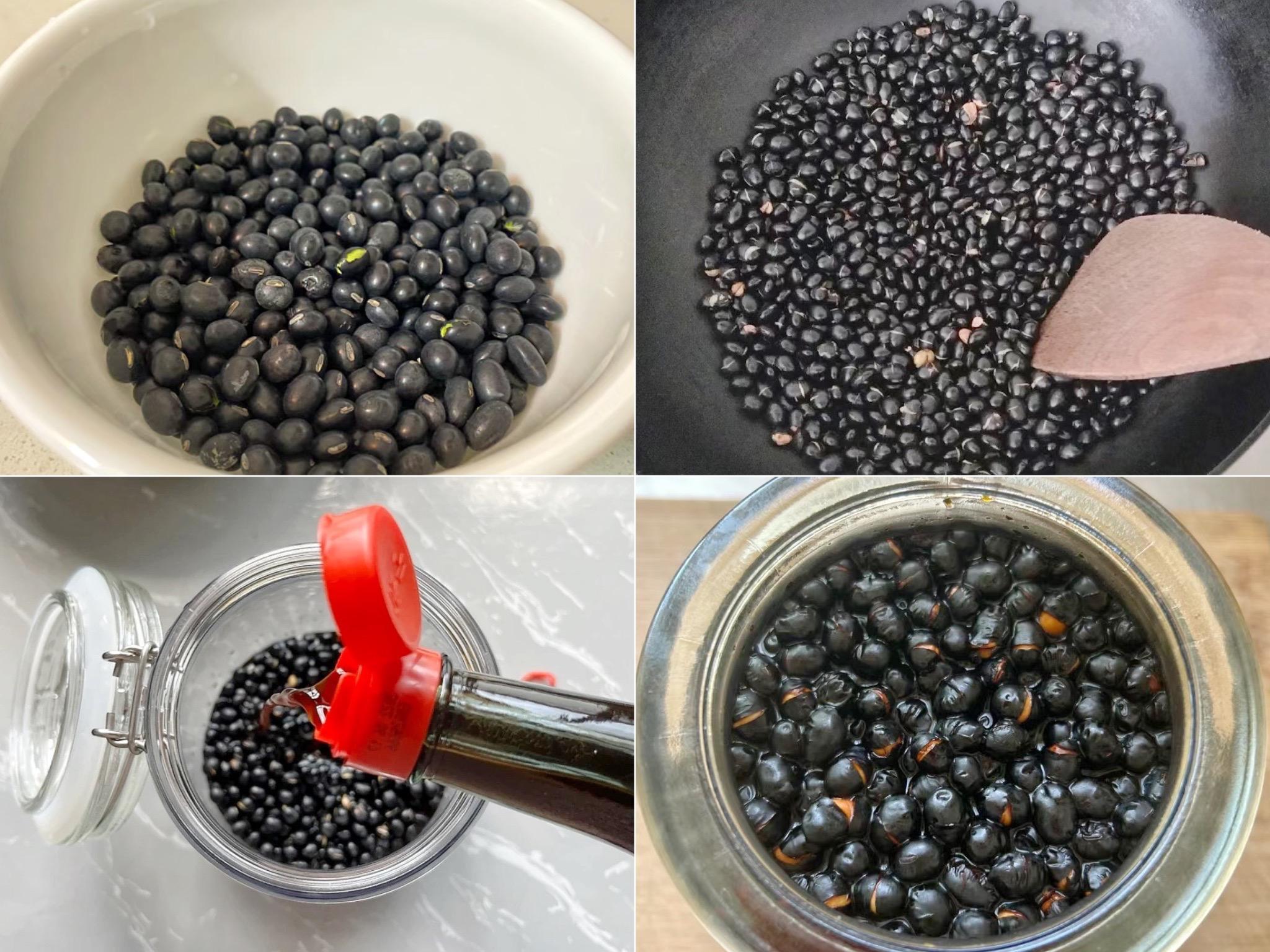 1、準備適量黑豆,洗淨後瀝乾水分,再倒入不粘鍋中,小火翻炒至豆子表面裂開,關火;