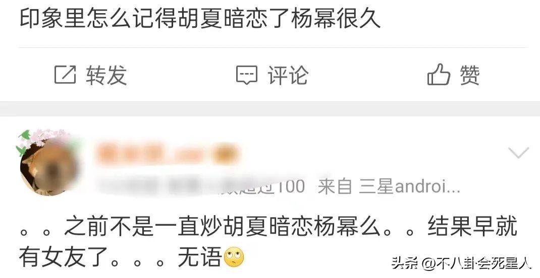 另一部分則是質疑吐槽,認爲胡夏模棱兩可,既然已經有女友,還在臺上說暗戀女星,話不講清楚,有炒作的可能,拉其他女星下水,現在他戀情曝光,楊冪鬱可唯陳都靈都可以放心了。