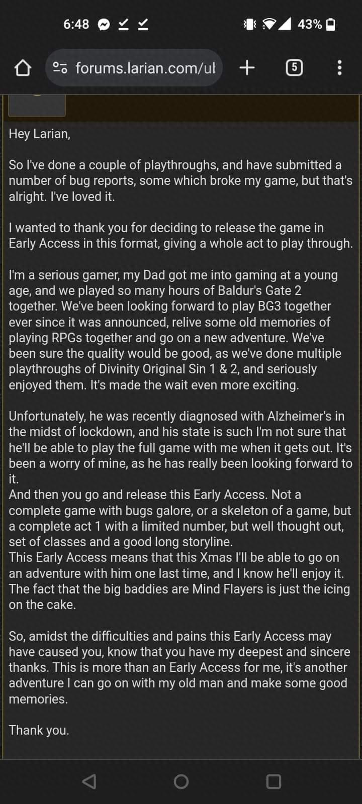 事情的起因還要從2020年講起。當時,一個名爲Solfalia的用戶在拉瑞安官方論壇上發佈一則帖子,內容是感謝他們提前發佈了《博德之門3》的搶先體驗版。