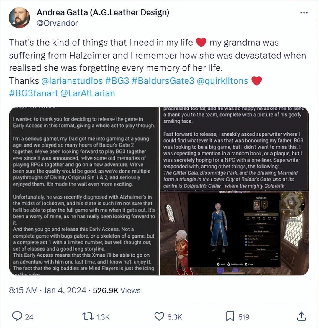 好消息是同年《博德之門3》便推出了搶先體驗版,讓Solfalia和父親能較早實現玩到遊戲的願望。Solfalia表示,這意味着他們今年聖誕節可以最後一次在新遊戲中進行一場冒險,給他們留下一段寶貴的回憶。