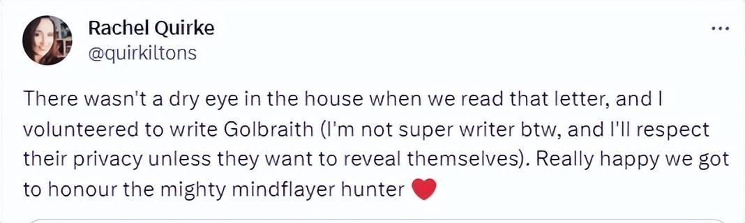 很快,一位拉瑞安開發者就來現身說法。她表示當時大家一起看到老者的信件時,在場的人都溼了眼眶,而這段內容正是她主動給這個角色寫的。