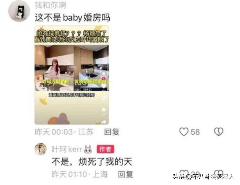 當時葉珂在評論區否認澄清,表示不是楊穎的婚房,還直言煩死了。
