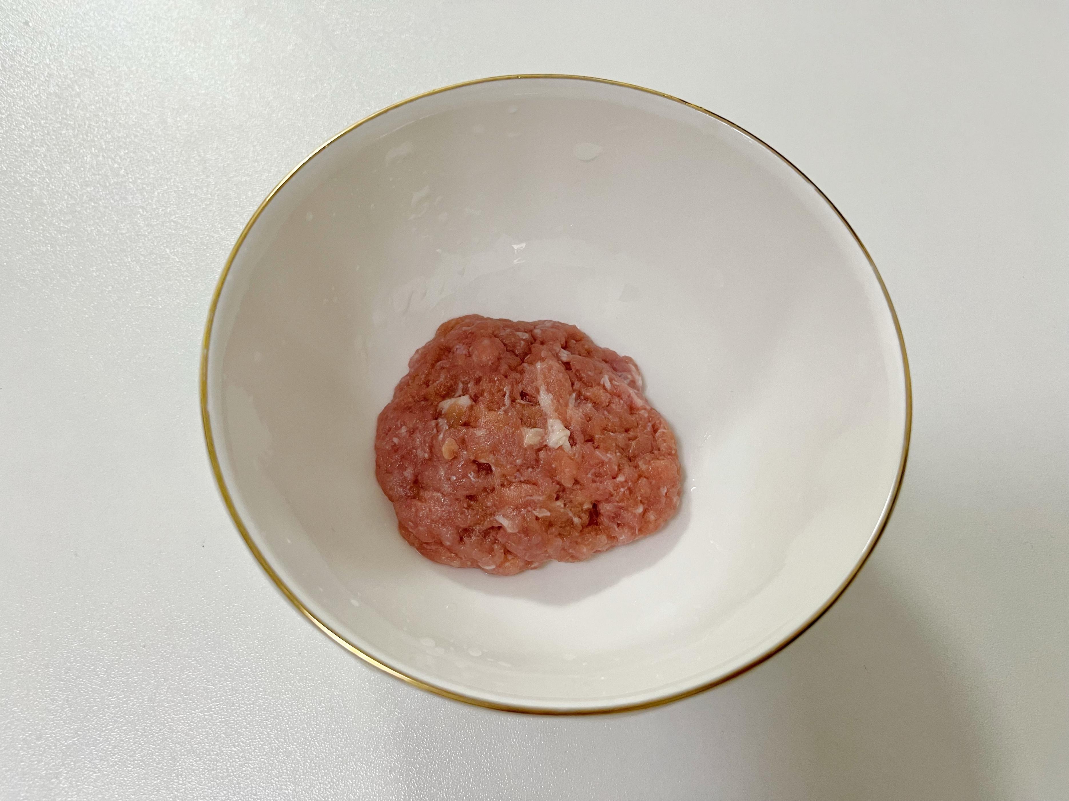 1、準備些豬瘦肉,建議用梅花肉,將肉攪打成肉餡,加些生抽、生粉,順着一個方向攪拌至上勁;