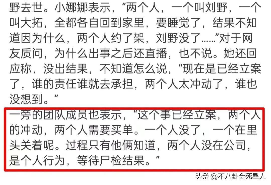 據小娜娜的描述,“劉野和大拓,全都各自回到家裏,準備要睡覺了,不知道因爲什麼,兩個人約了架,劉野沒了”。