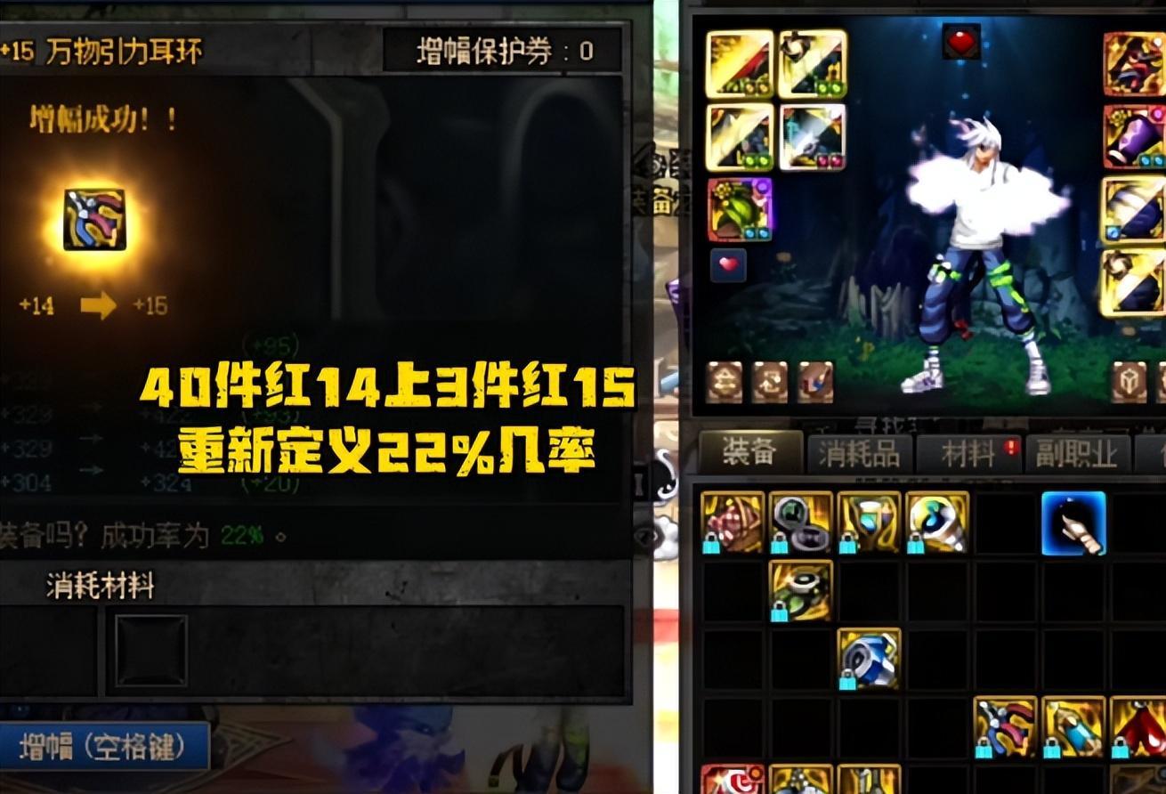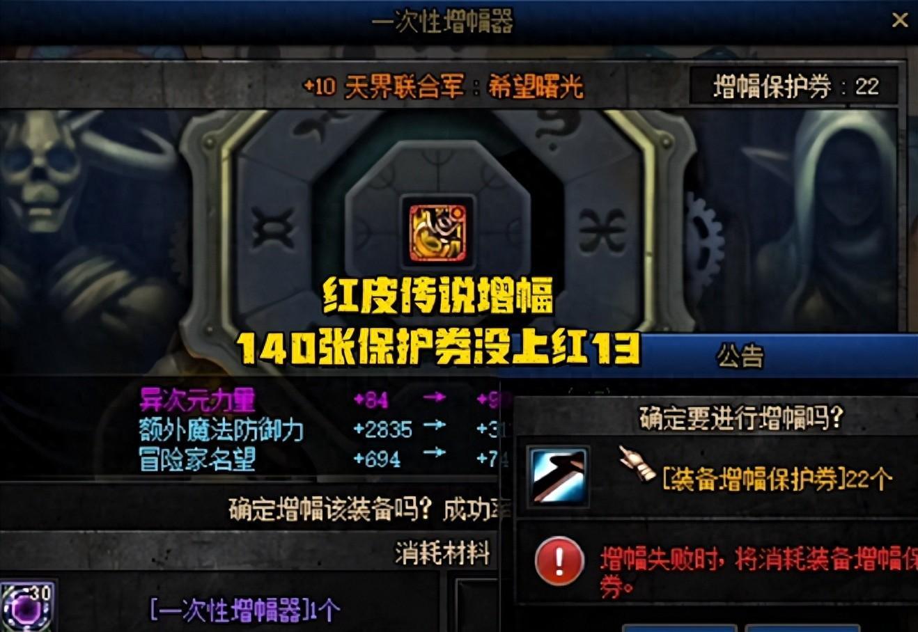花了140多張增幅保護券,愣是沒衝上一件紅13裝備(傳說裝備只能用保護券),結果又有40件紅14只成了3件紅15,增幅成功率僅有7.5%,這就是如今的概率,難怪一陣雨心態就破防了;