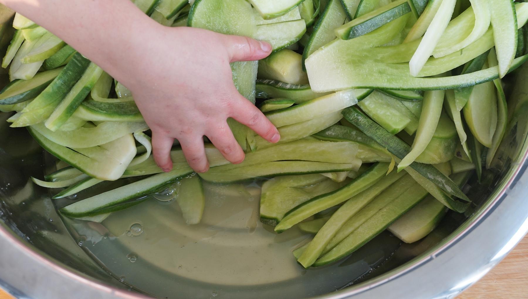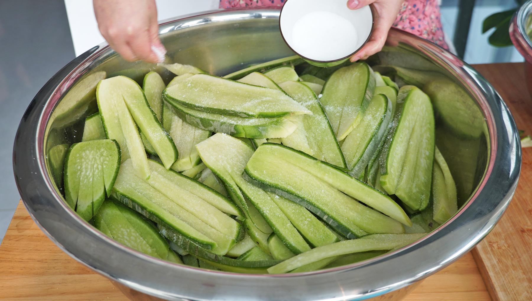 3、全部切完了再裝入大盆裏,加50克鹽醃製2個小時,讓蘿蔔出一下水。這個蘿蔔雖然口感不是很辛辣,但鹽可以加速蘿蔔的出水,讓蘿蔔再晾曬的過程中加縮短時間,所以醃製一下也是很有必要的。
