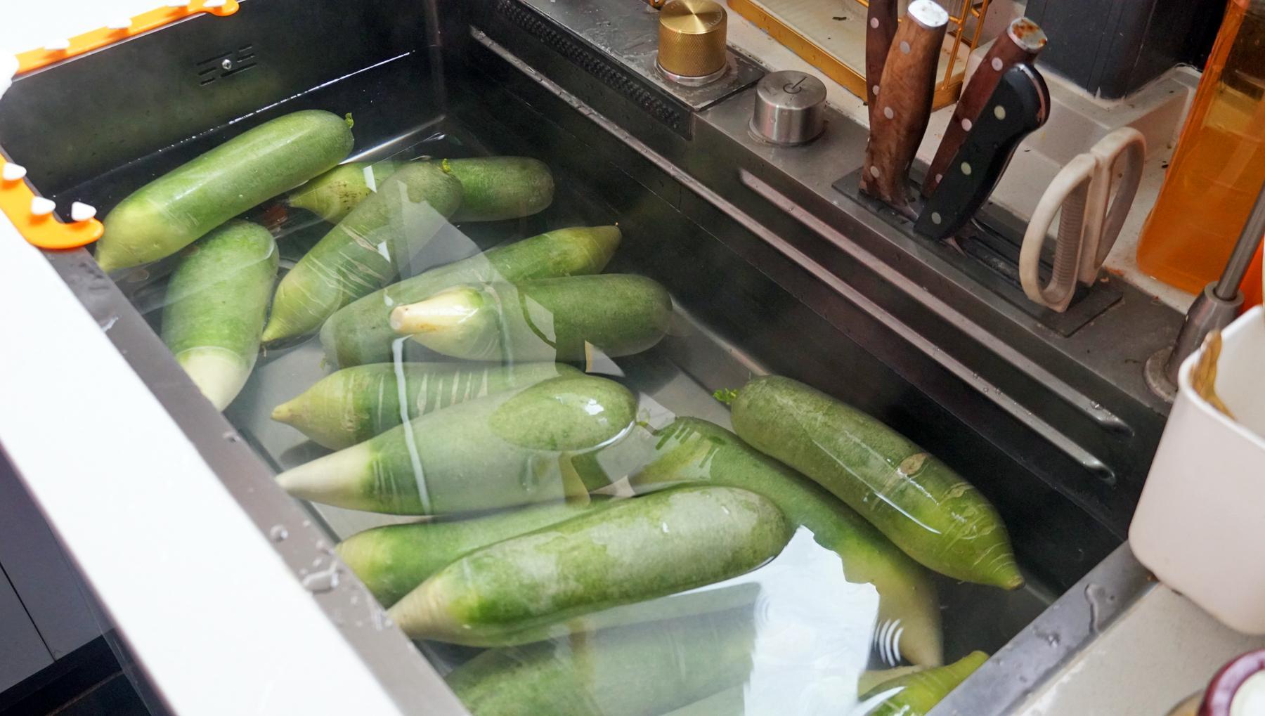 1、這裏是35斤蘿蔔,先來洗乾淨了,今天我們用的是綠色的蘿蔔,也被叫水果蘿蔔,這個蘿蔔的口感沒有白色和紅色的那麼辛辣,喫起來微微有點甜,很適合生喫。