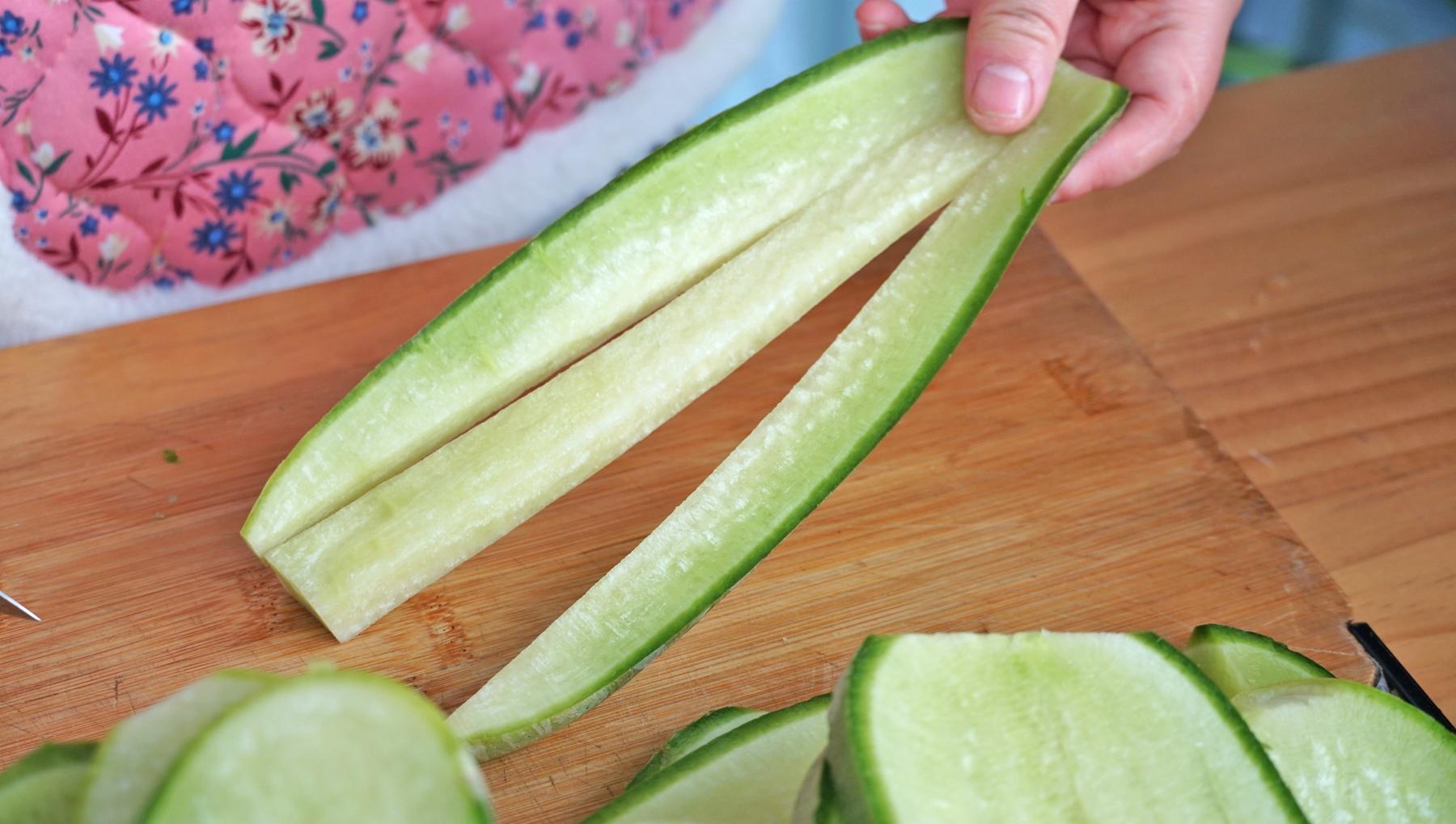 2、再把頭和尾削一下,接着來切,不用刮皮,直接切成大片片,再挨個切成小長條,中間不要切斷了,像這樣就可以。