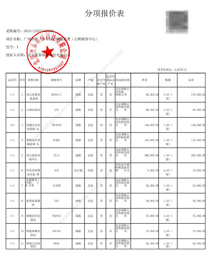 根據儀器左上角的LOGO,可以查到設備的生產商爲北京奧泰瑞格科技有限公司,根據天眼查提供的信息,這家成立於2007年的企業主營業務爲科技推廣與應用服務,曾與國內多家高校有過合作,旗下的“瑞格科技”研發了包括智能宣泄儀在內的多款互動設備,而學校採購單中其他的儀器,也均是從該公司購買。