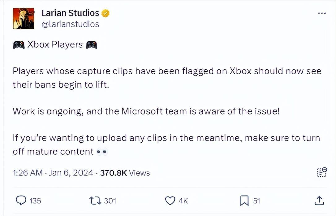 近日,拉瑞安官方公開告知Xbox玩家們,微軟方面已經開始着手處理該問題,賬號被封禁的玩家們正在逐個解封。