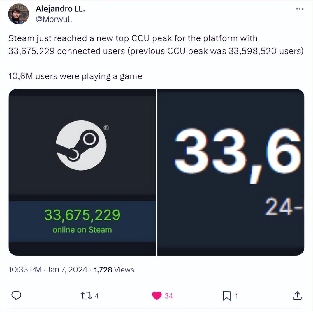 Steam最高同時在線數突破3360萬 / 《奧本海默》獲金球獎五項大獎