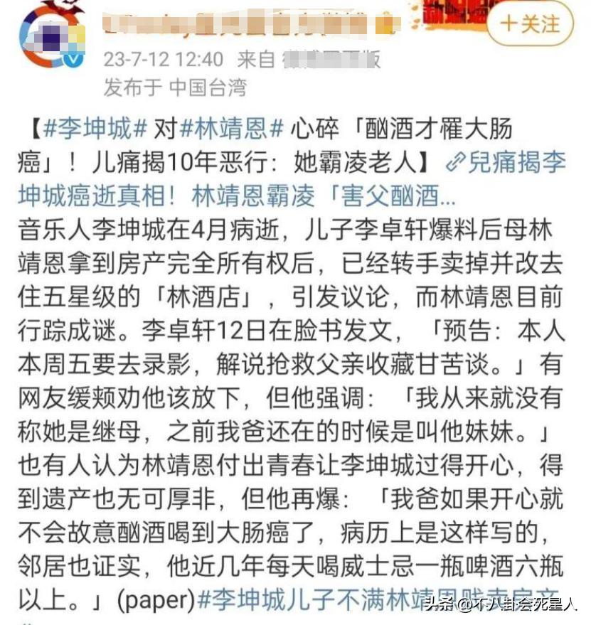 當年17歲的林靖恩嫁給大自己40歲的作詞人李坤城,也讓大家覺得不可思議,可惜的是李坤城沒有那麼長壽,在今年四月就因病去世,享年67歲,留下了才27歲的林靖恩。