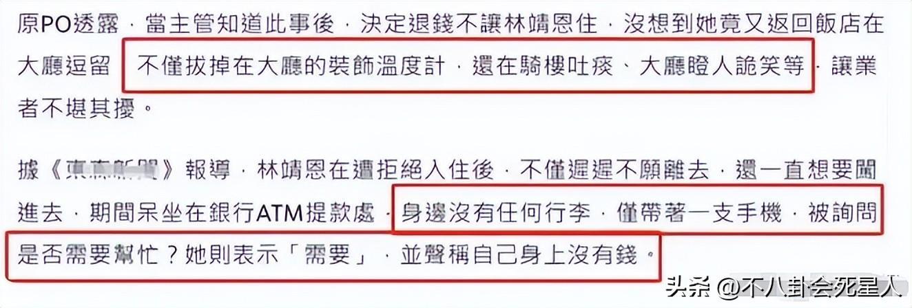 本以爲繼承了大筆遺產的林靖恩,應該過得非常瀟灑,可沒想到近日她卻被爆料突然發瘋打砸酒店的東西,後來又流落街頭,前往ATM機旁休息,口裏不知道唸叨着什麼,像是精神失常了。