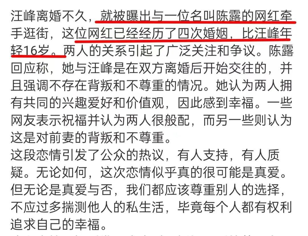 對於葛薈婕的爆料,汪峯沒有理會,並無相關回應。從網上的信息來看,汪峯的新女友名叫陳露,是位網紅,經歷了四次婚姻,比汪峯年輕16歲。