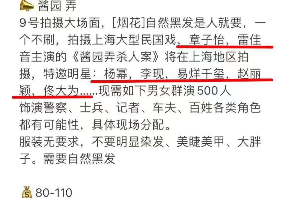 而且,這部戲的陣容強大,不僅有章子怡,還有雷佳音、楊冪、李現、易烊千璽、趙麗穎、佟大爲等助陣,於9日拍攝外景。