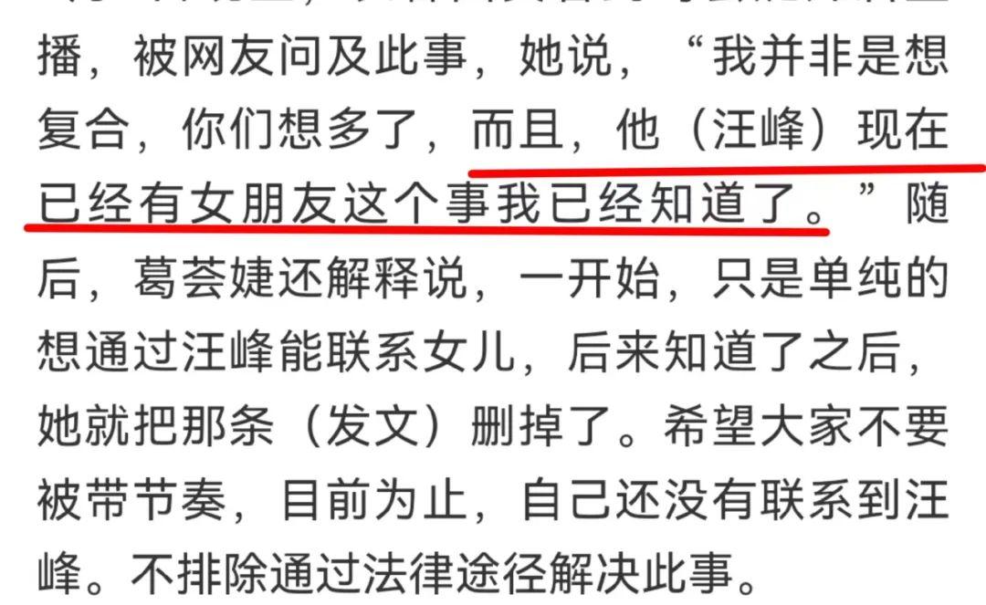近日,葛薈婕回應了幾天前她深夜喊話汪峯的事情,她否認複合,稱只是想聯繫女兒,同時爆料汪峯已有女友。