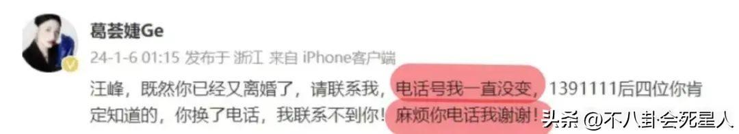 葛薈婕的這番話,信息量有點大,關於她深夜喊話的事,情況是這樣的,在1月6日,她發文稱“汪峯,既然你已經又離婚了,請聯繫我,號碼沒變”。