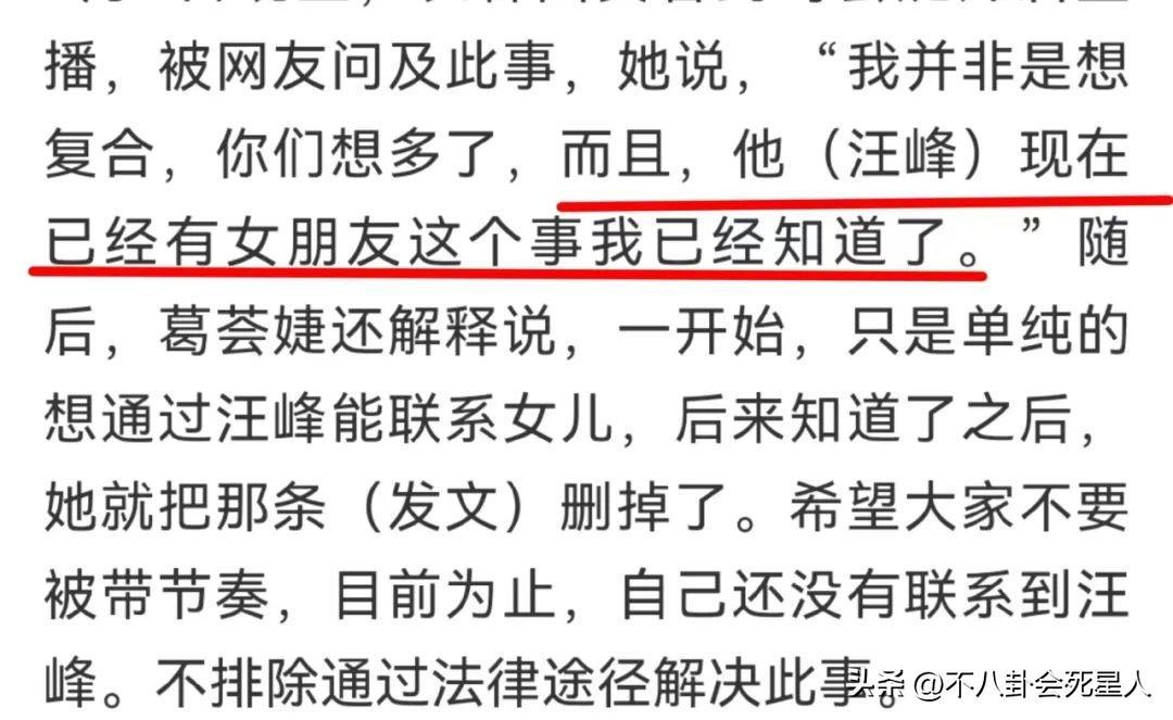 近日,葛薈婕回應了幾天前她深夜喊話汪峯的事情,她否認複合,稱只是想聯繫女兒,同時爆料汪峯已有女友。