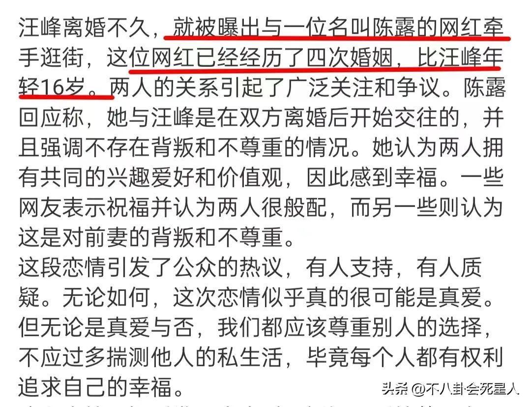 對於葛薈婕的爆料,汪峯沒有理會,並無相關回應。從網上的信息來看,汪峯的新女友名叫陳露,是位網紅,經歷了四次婚姻,比汪峯年輕16歲。