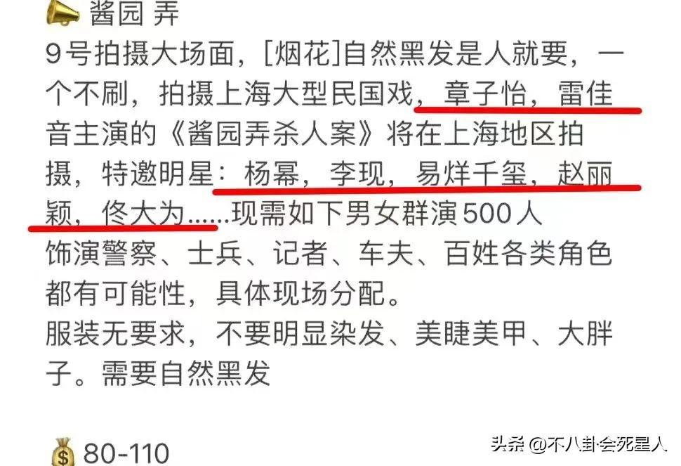 而且,這部戲的陣容強大,不僅有章子怡,還有雷佳音、楊冪、李現、易烊千璽、趙麗穎、佟大爲等助陣,於9日拍攝外景。