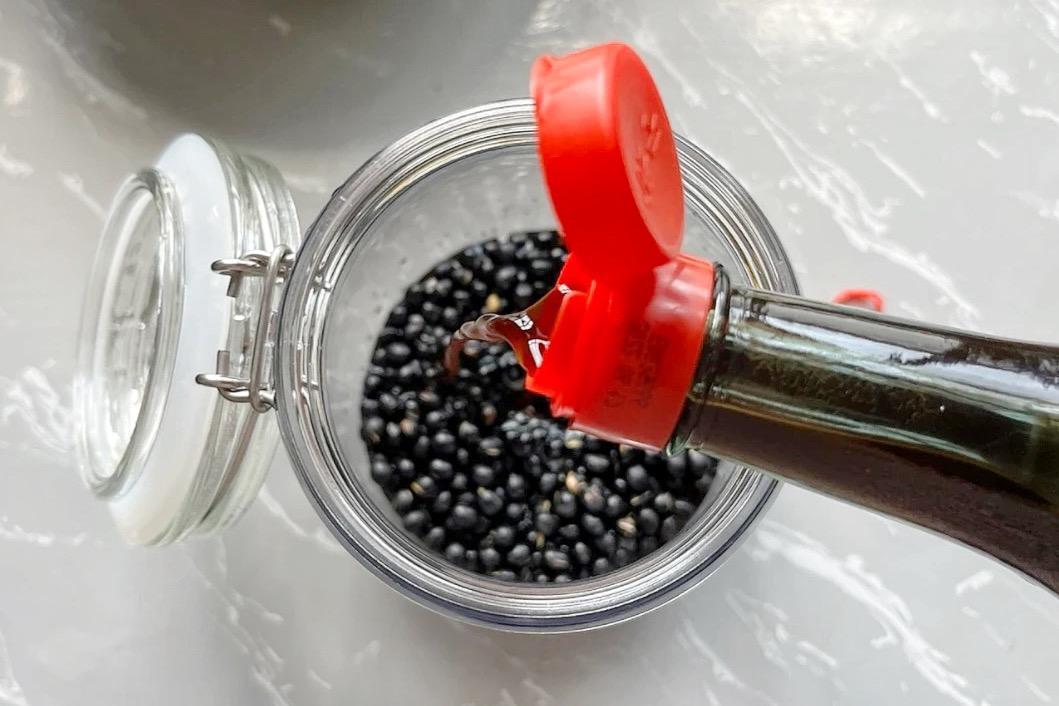 3、準備一個乾燥、無油、無水的容器,將黑豆倒進去,再加入陳醋;