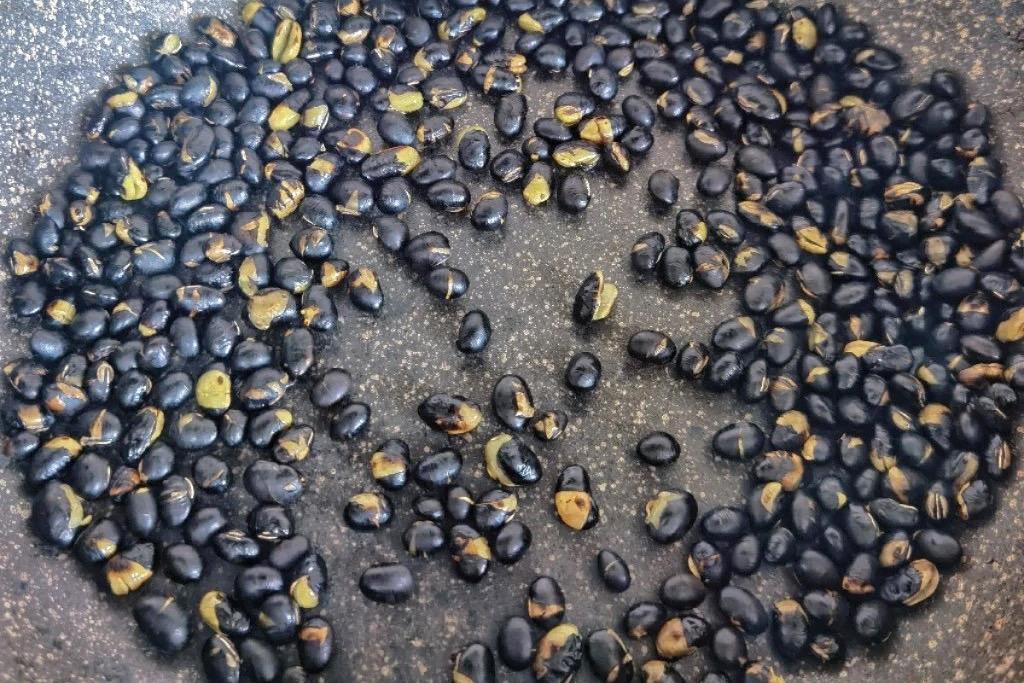 2、將黑豆倒入不粘鍋中,小火不斷翻炒,直至黑豆表皮崩開;