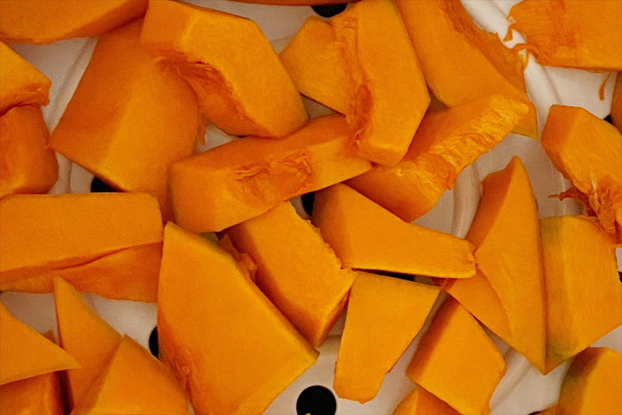 1、南瓜去皮、去瓜瓤,洗淨後切小塊,放入蒸鍋中隔水蒸20分鐘;
