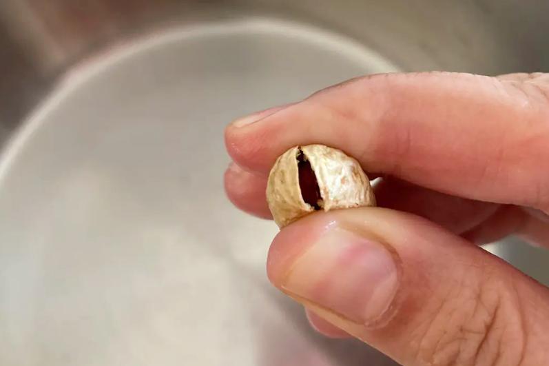 2、像下圖這樣,用手在花生殼兩頭掐出一道縫;