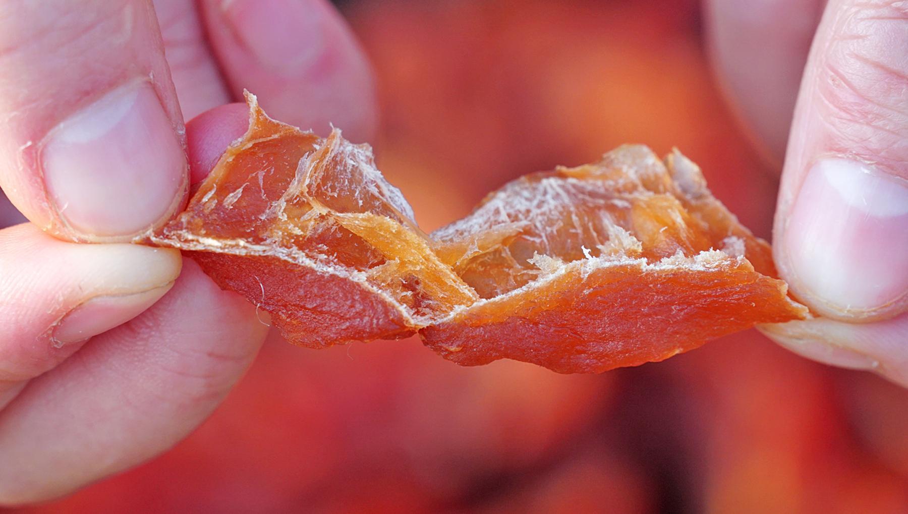 這個蘋果乾喫起來是酸酸甜甜的,口感和柿子幹有點像,軟軟的,但很有嚼勁兒,喫起來就是軟軟糯糯的,又有點拉絲的感覺。