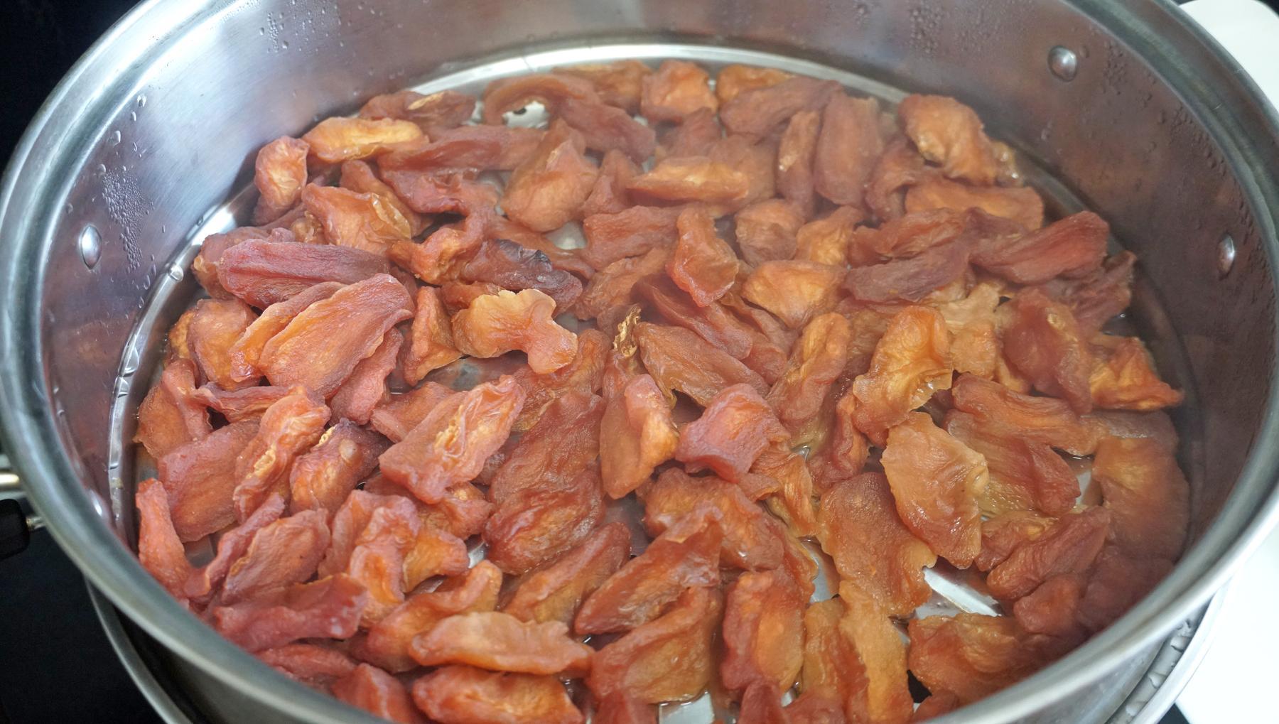 1、第一遍蘋果乾曬好後就收回去繼續蒸第二遍,步驟都是一樣的,倒入蒸籠,大火蒸20分鐘。